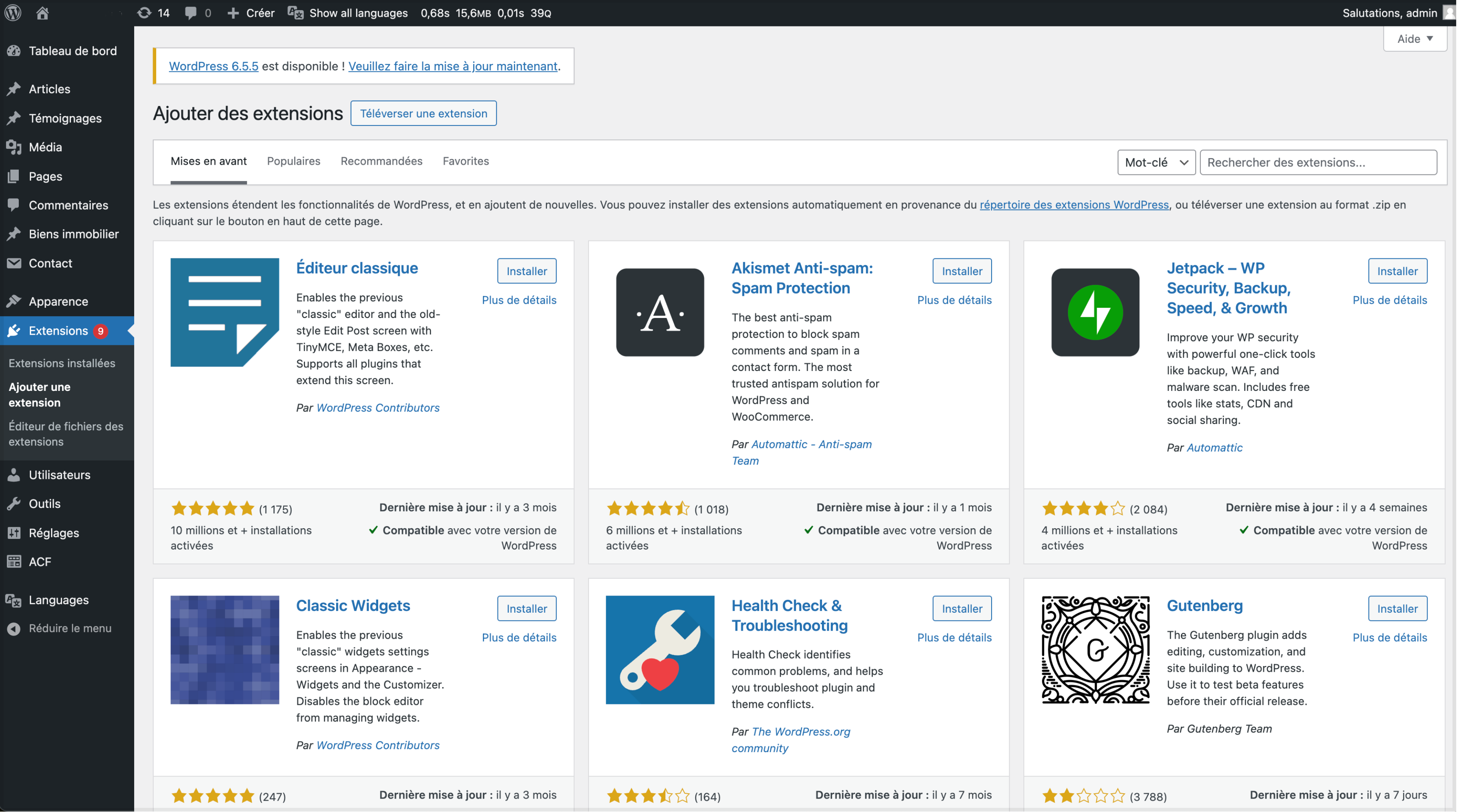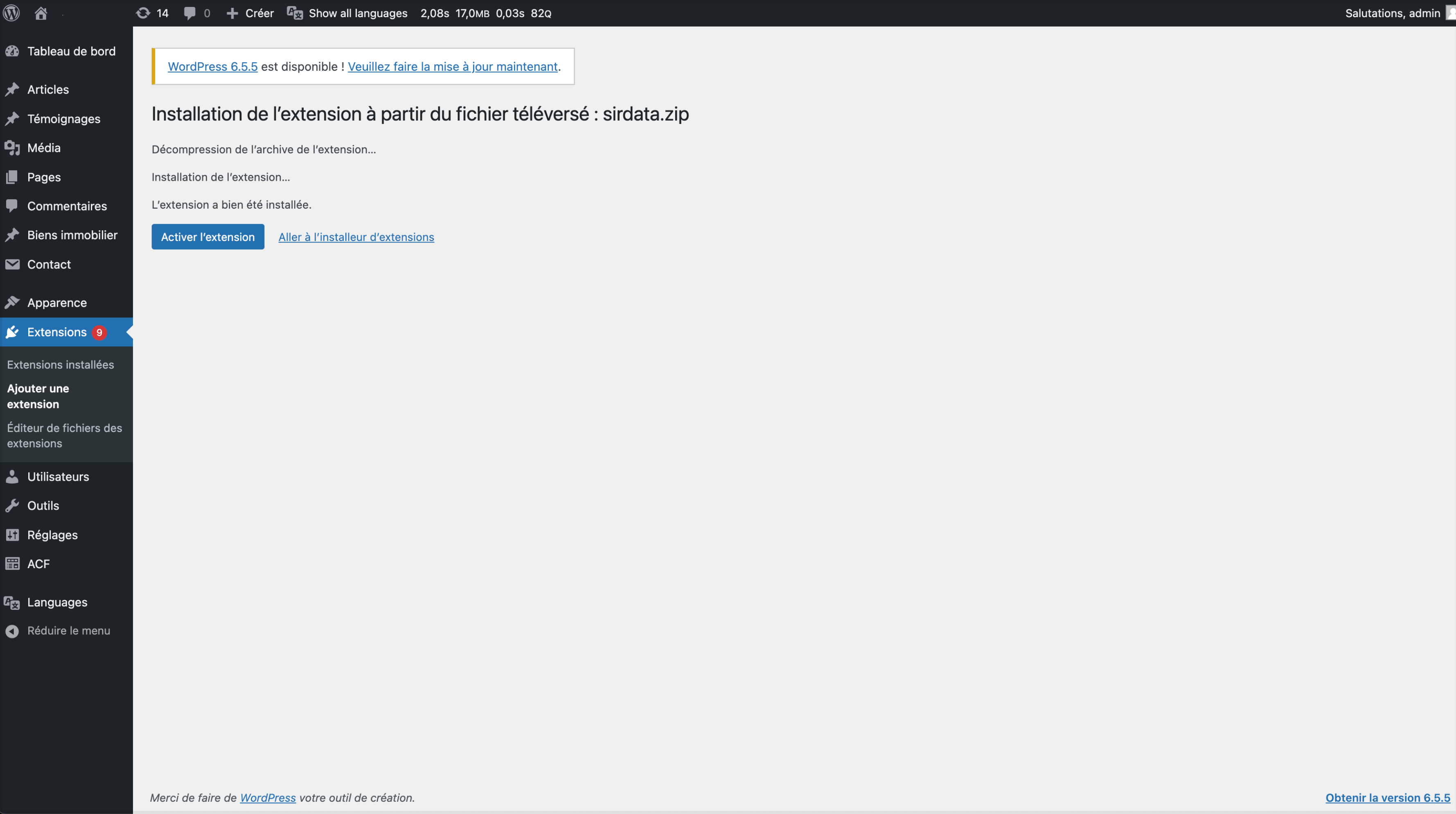 2. **Dans Wordpress** sélectionnez « Ajouter une extension » dans la section Extensions