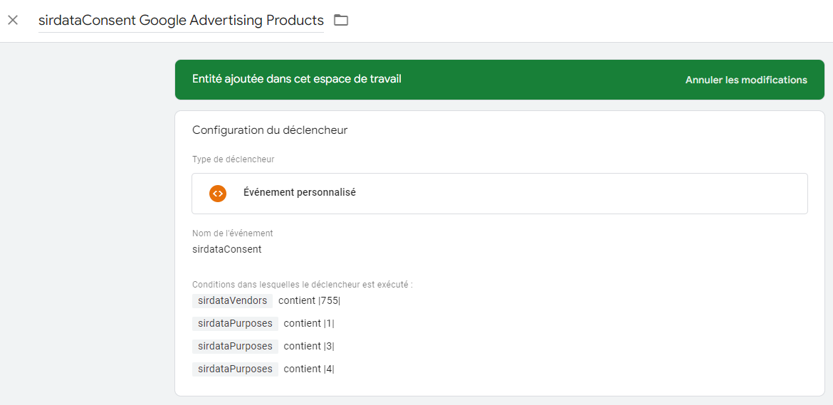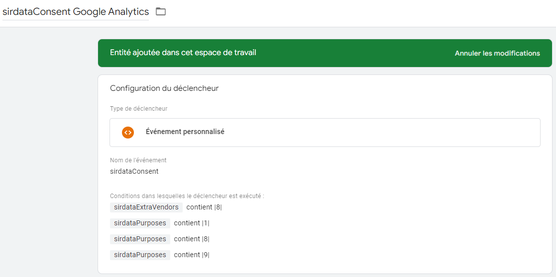 * Créer un déclencheur "événement personnalisé" avec "sirdataConsent" dans le champ "Nom de l'événement"&#x20;