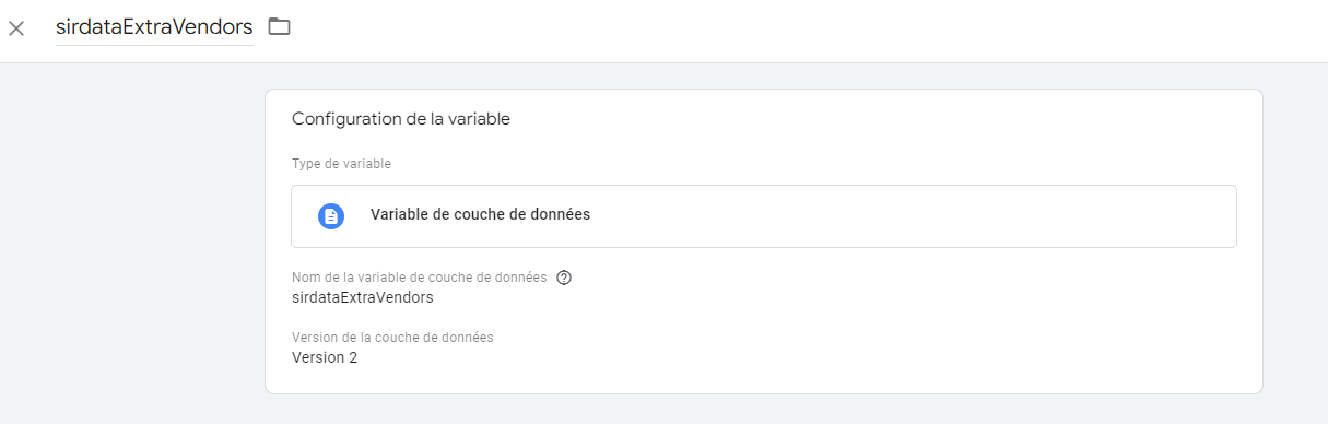 <figure><img src="https://2240931758-files.gitbook.io/~/files/v0/b/gitbook-x-prod.appspot.com/o/spaces%2F-MUspPnkTFMlMDdGxvAb-2584506019%2Fuploads%2FLA2zYParOnAFrMM8M5w7%2Fimage.png?alt=media&#x26;token=ee85de20-bbb5-4918-8a57-78506c0b8c19" alt=""><figcaption><p>variable de couche de données "sirdataExtraVendors"</p></figcaption></figure>