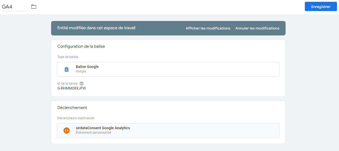 <figure><img src="https://2240931758-files.gitbook.io/~/files/v0/b/gitbook-x-prod.appspot.com/o/spaces%2F-MUspPnkTFMlMDdGxvAb-2584506019%2Fuploads%2FUAAmCenVjCJ3sCix0FwC%2Fimage.png?alt=media&#x26;token=31e14d99-c7af-47ff-a1ba-accd23b2c2a2" alt=""><figcaption><p>Modèle "Sirdata CMP | Google Consent Mode"</p></figcaption></figure>
