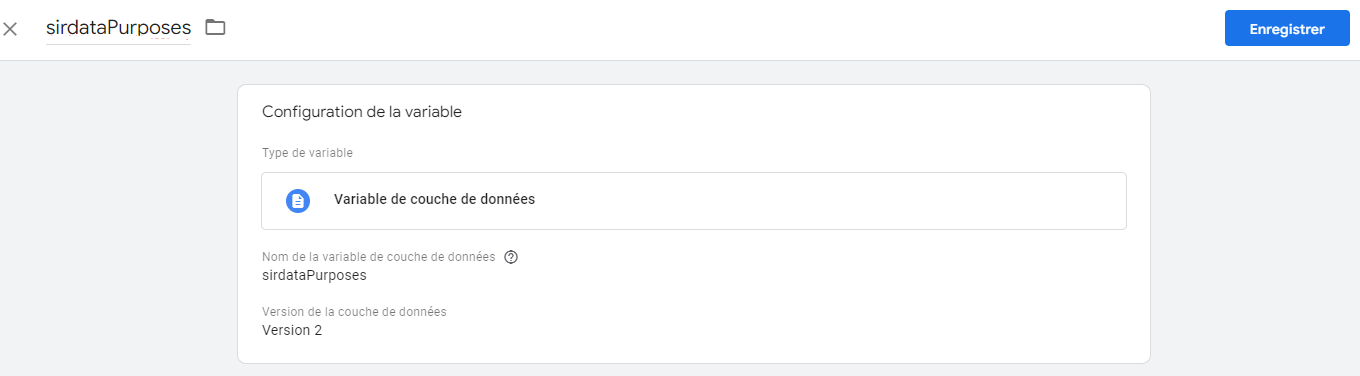 <figure><img src="https://2240931758-files.gitbook.io/~/files/v0/b/gitbook-x-prod.appspot.com/o/spaces%2F-MUspPnkTFMlMDdGxvAb-2584506019%2Fuploads%2F3lTF0ZnwVwPFnKvySPVG%2Fimage.png?alt=media&#x26;token=c77ec351-0c29-43bc-8eb0-774afac02ccc" alt=""><figcaption><p>variable de couche de données "sirdataPurposes"</p></figcaption></figure>