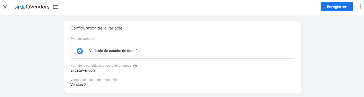 * Créer une première "variable de couche de données" : "sirdataVendors" :&#x20;