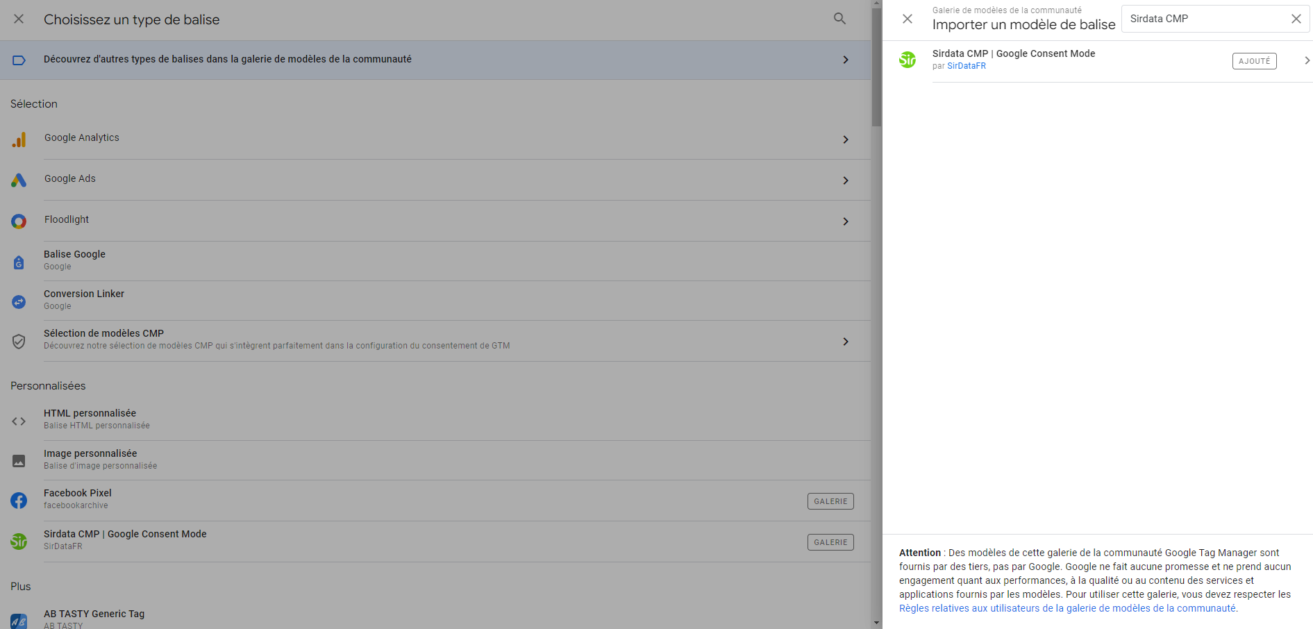 <figure><img src="https://2240931758-files.gitbook.io/~/files/v0/b/gitbook-x-prod.appspot.com/o/spaces%2F-MUspPnkTFMlMDdGxvAb-2584506019%2Fuploads%2FRpkbhA6XMmytyy9rfIAJ%2Fimage.png?alt=media&#x26;token=3976fe2f-a83c-4c88-9c69-6c45d1840e71" alt=""><figcaption><p>Modèle de balise "Sirdata CMP | Google Consent Mode" </p></figcaption></figure>
