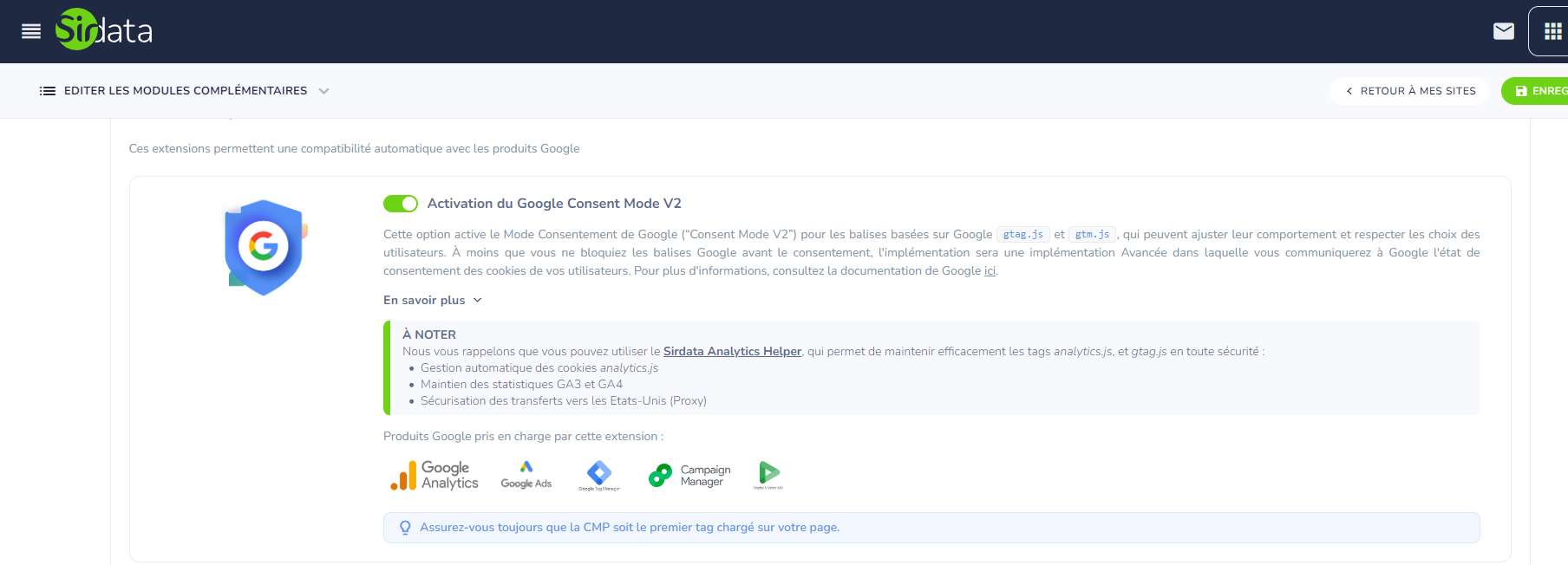 L'option du Google Consent Mode est activée par défaut avec la CMP Sirdata :&#x20;
