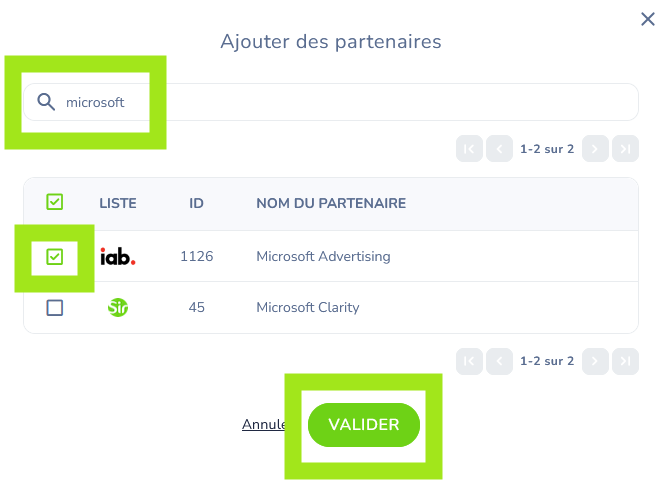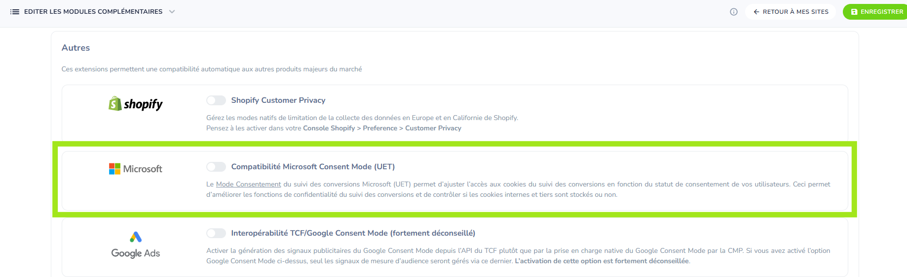 **Pour activer le Microsoft UET Consent Mode, il vous suffit d'ajouter&#x20;*****Microsoft Advertising*****&#x20;à la liste de vos partenaires, ou d'activer manuellement l'option de&#x20;*****compatibilité Microsoft UET Consent Mode*****. Le premier active le second et réciproquement.**